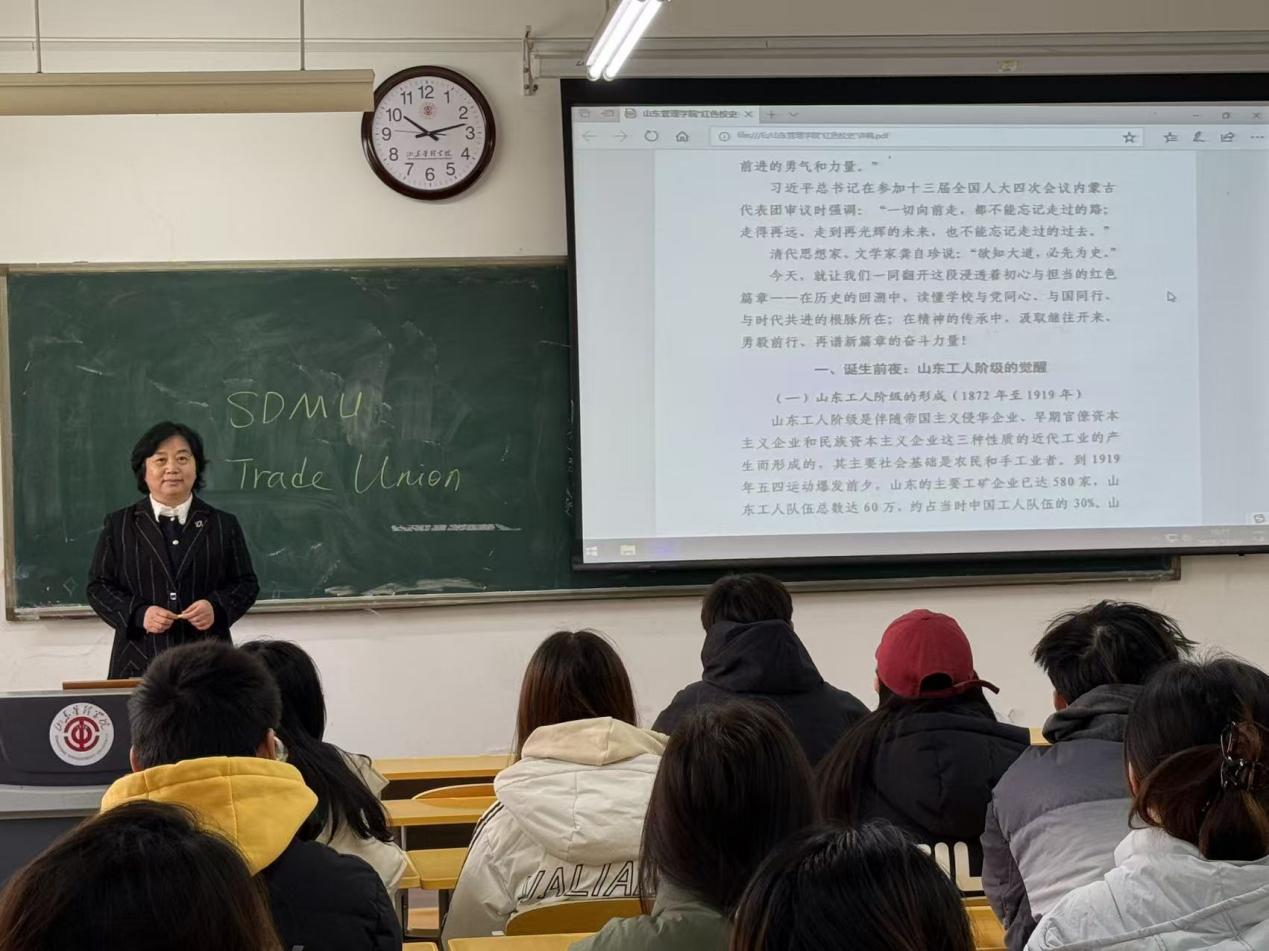 课堂上,侯雪丽以 “校史见国史,初心映使命” 为主线,回溯学校八十余载征程:1938 年诞生于沂水县,1950 年迁至济南,1987 年改建为山东省工会管理干部学院开启学历教育,2013 年获批升格为本科高校并定名山东管理学院。她强调,学校始终坚守 “为党育人、为国育才” 初心,与党和国家同呼吸共命运,“明德弘毅,博学笃行” 的校训精神已融入师生血脉。结合专业特色,侯雪丽还介绍了学校与澳大利亚墨尔本理工学院等国外高校的深度合作,凸显为学子提供的广阔成长平台。