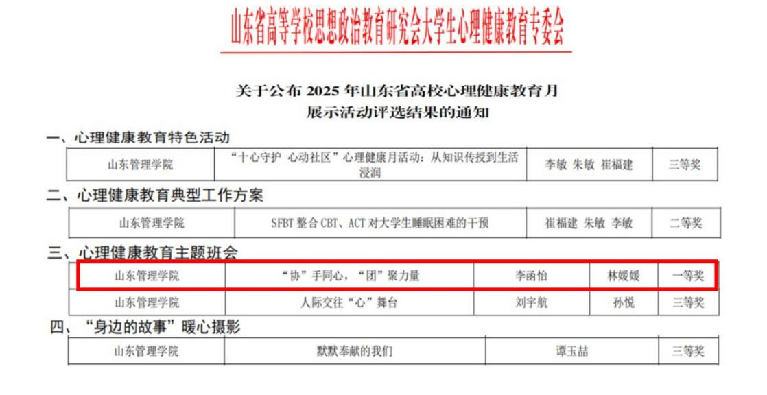 近日,在山东省高校思想政治教育研究会大学生心理健康教育专委会组织的2025年山东省高校心理健康教育月评选中,国际交流学院由林媛媛老师指导、李函怡同学负责的心理健康教育主题班会项目,荣获省级一等奖。