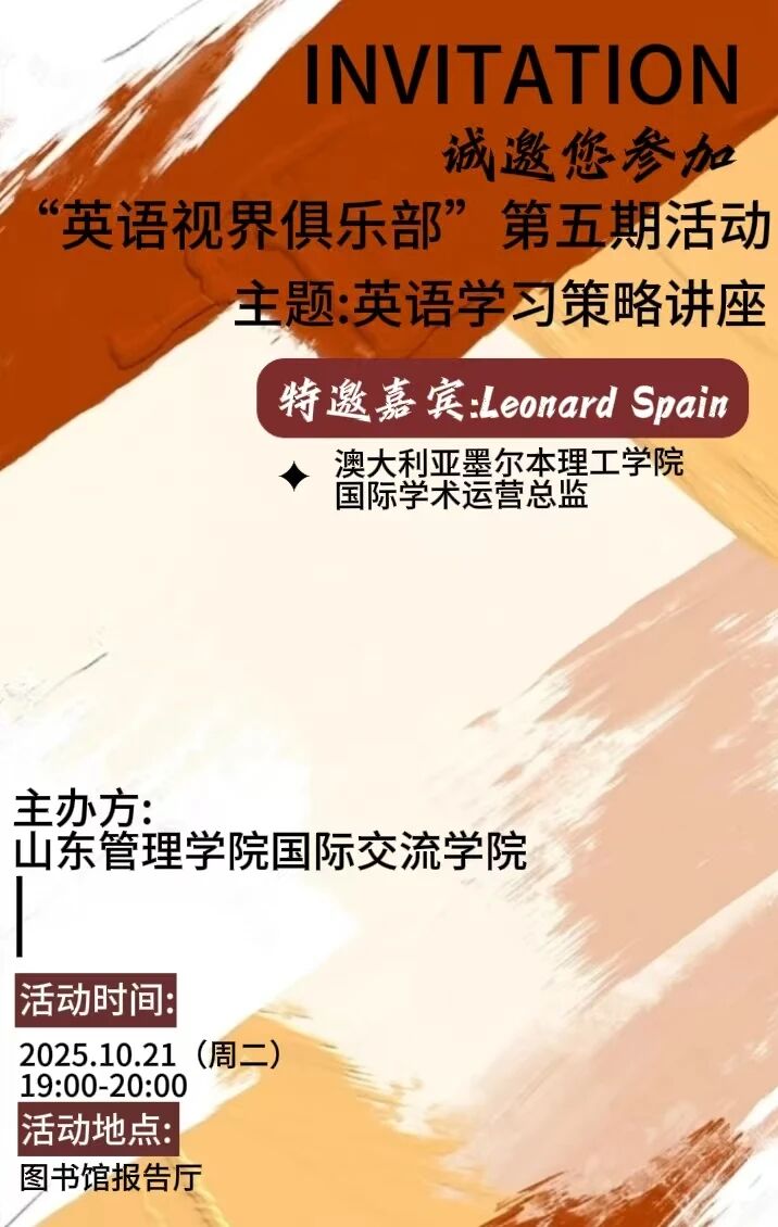 我们诚挚地邀请您参加山东管理学院国际交流学院主办的 “英语视界俱乐部” 第五期活动——英语学习策略讲座。
